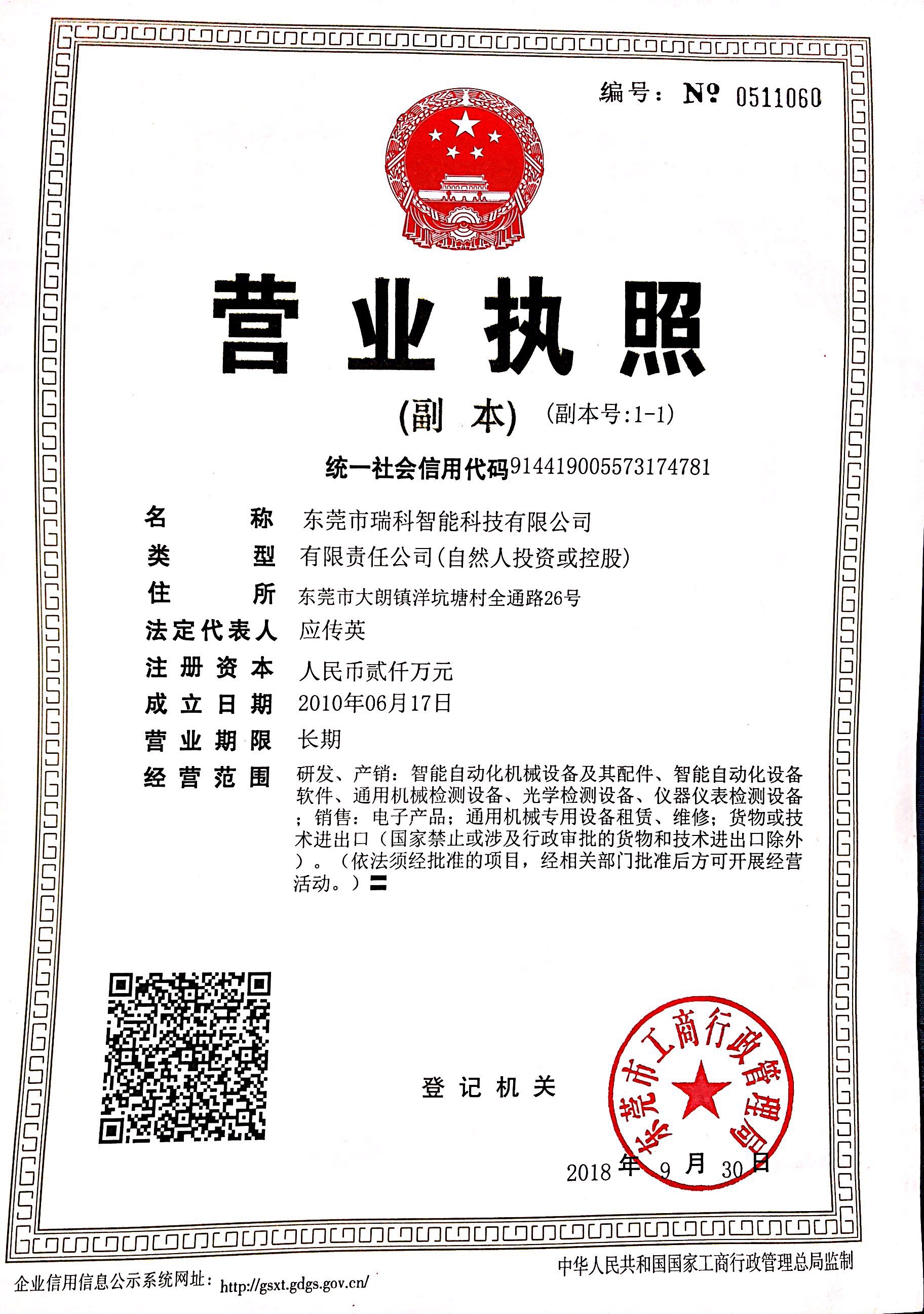 2018年9月30號,東莞市瑞科智能科技有限公司獲得東莞市工商行政管理局注冊成功的新營業(yè)執(zhí)照,東莞市瑞科自動化設(shè)備有限公司正式更名為東莞市瑞科智能科技有限公司,標(biāo)志著瑞科又發(fā)展到一個新的高度。